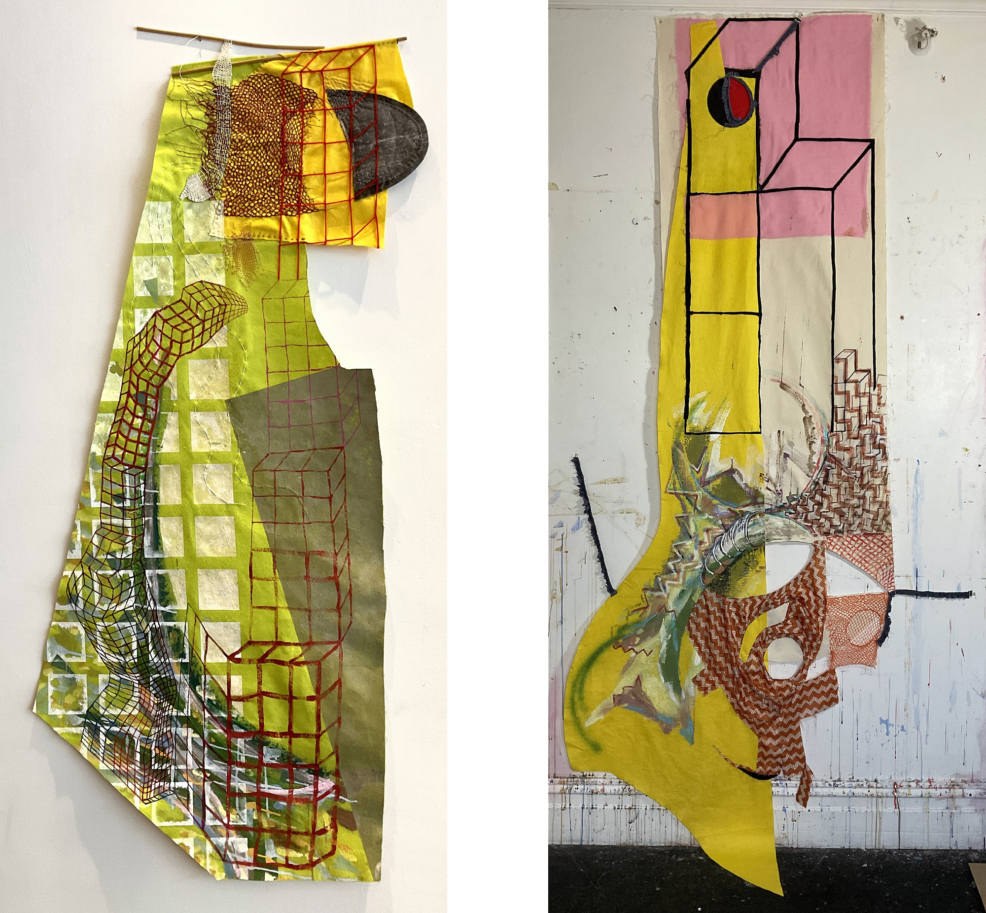 muslin, felt, canvas, silk, netting, fabric remnants, charcoal, watercolour, acrylic paint, stitching; 263 x 130 x 25 cm