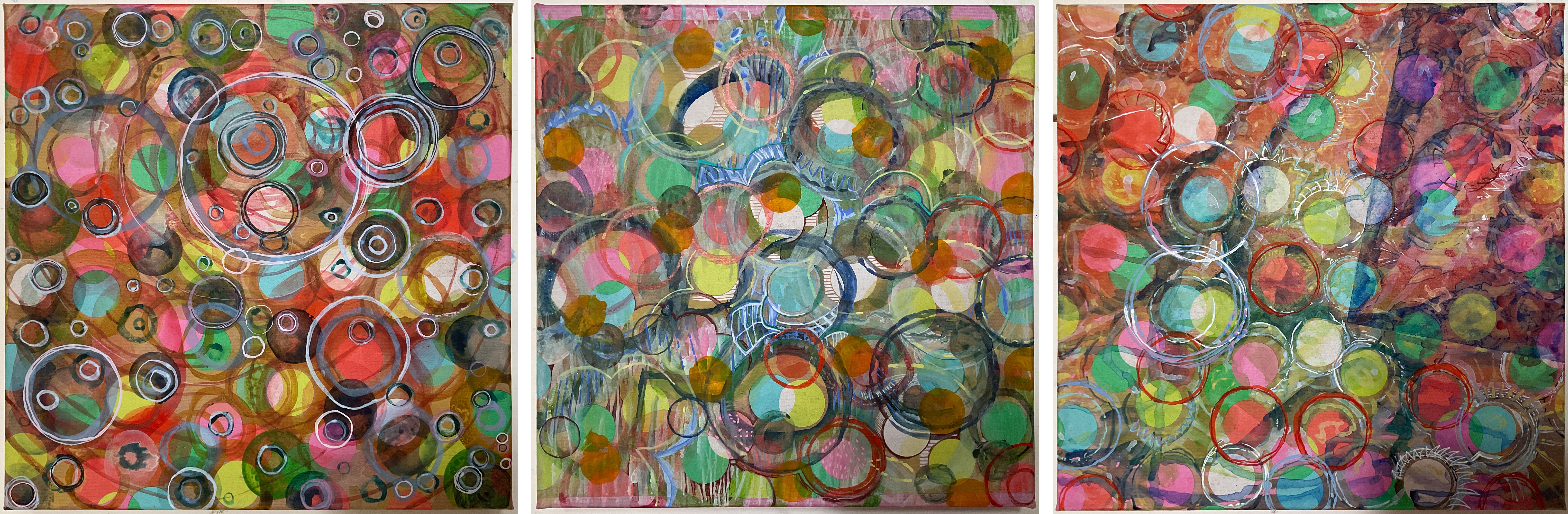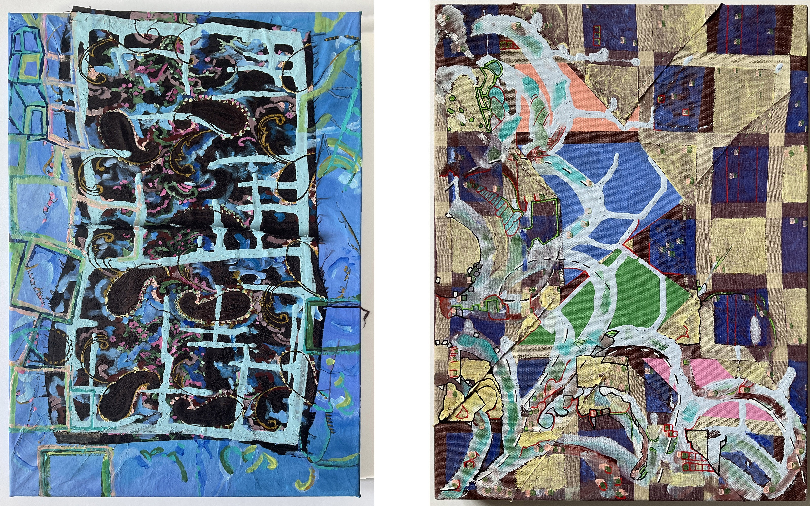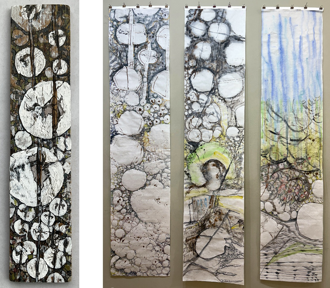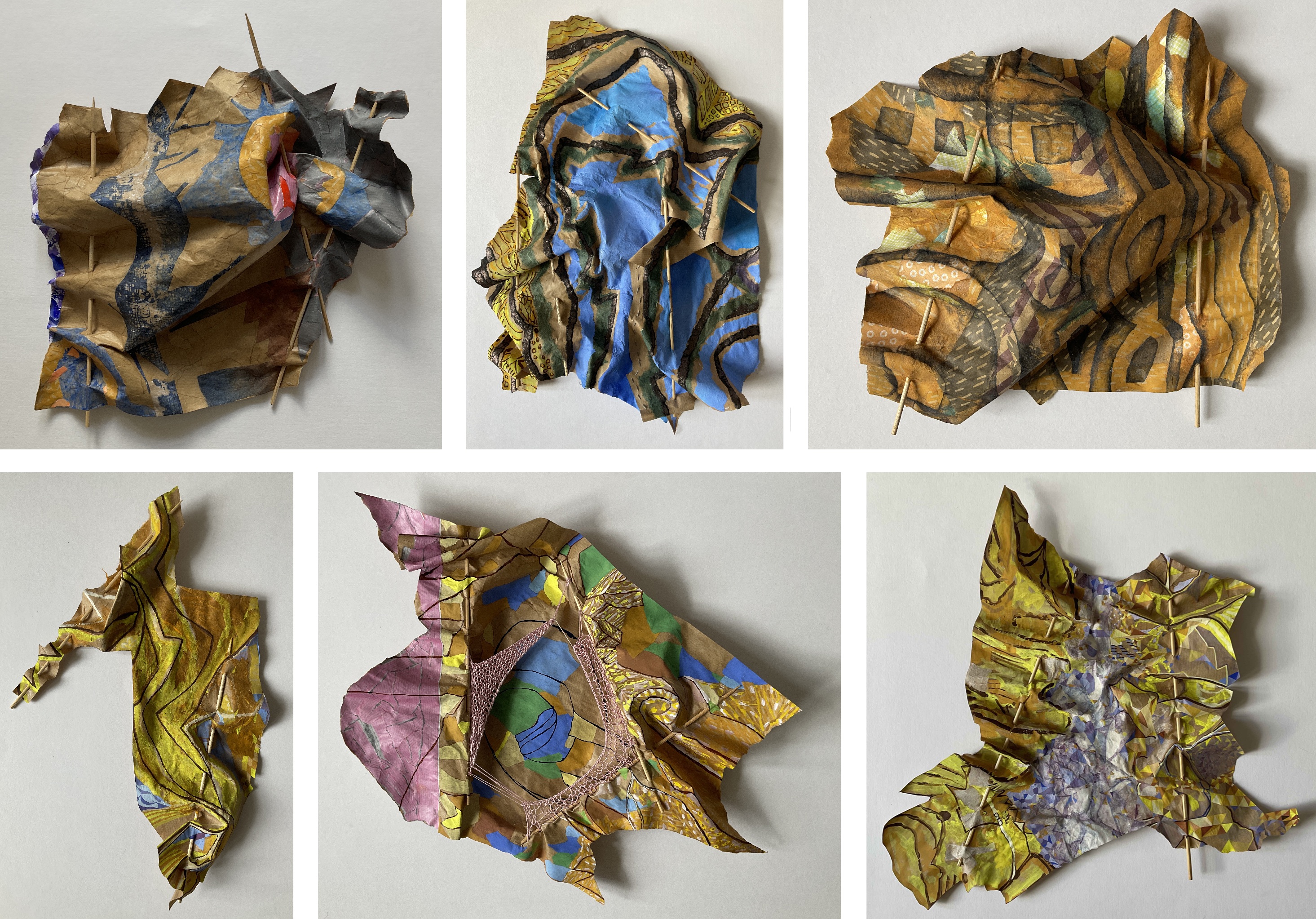 watercolour, gouache, acrylic, ink, charcoal, bamboo skewers, cotton thread, paper, pva