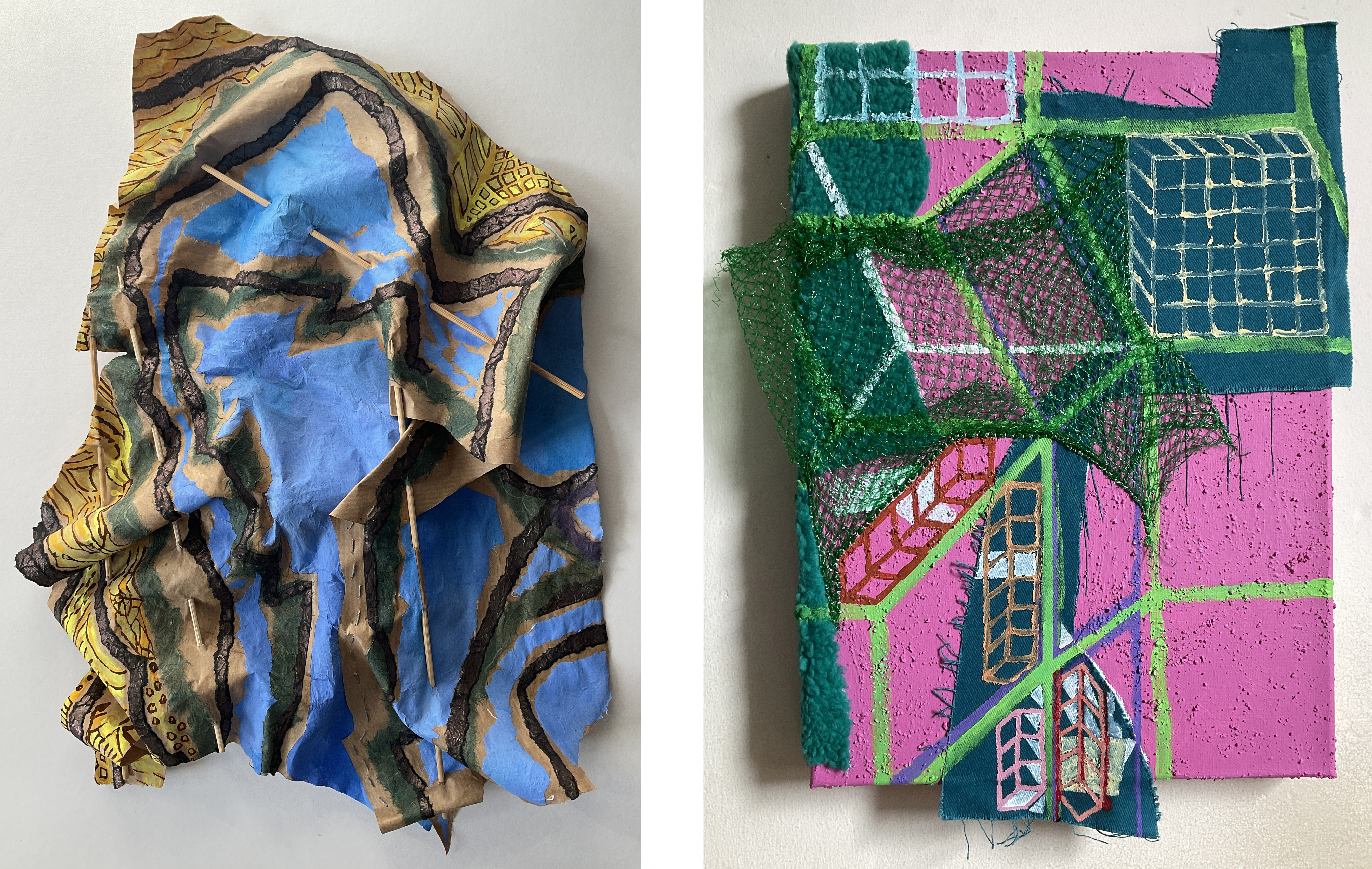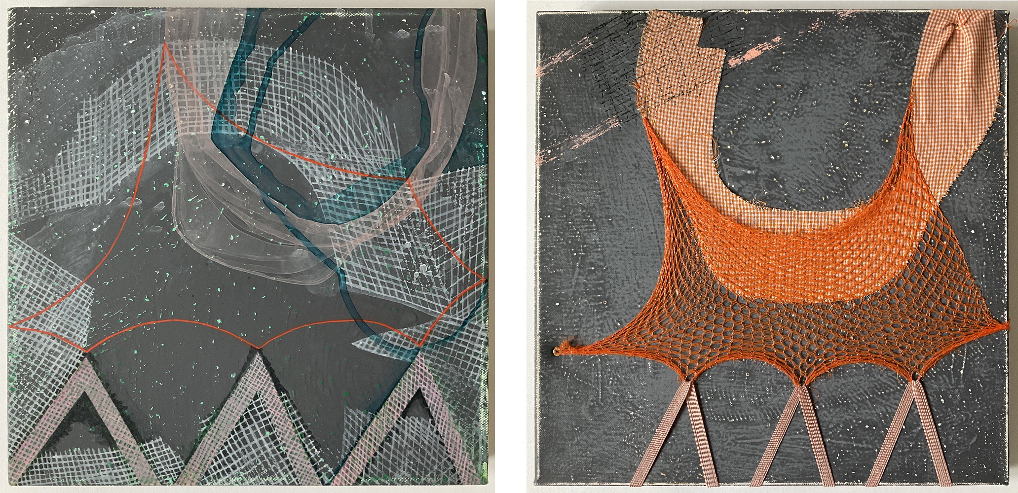 acrylic and emulsion paint, netting, fabric, cotton thread, canvas; 47 x 37 x 4 cm