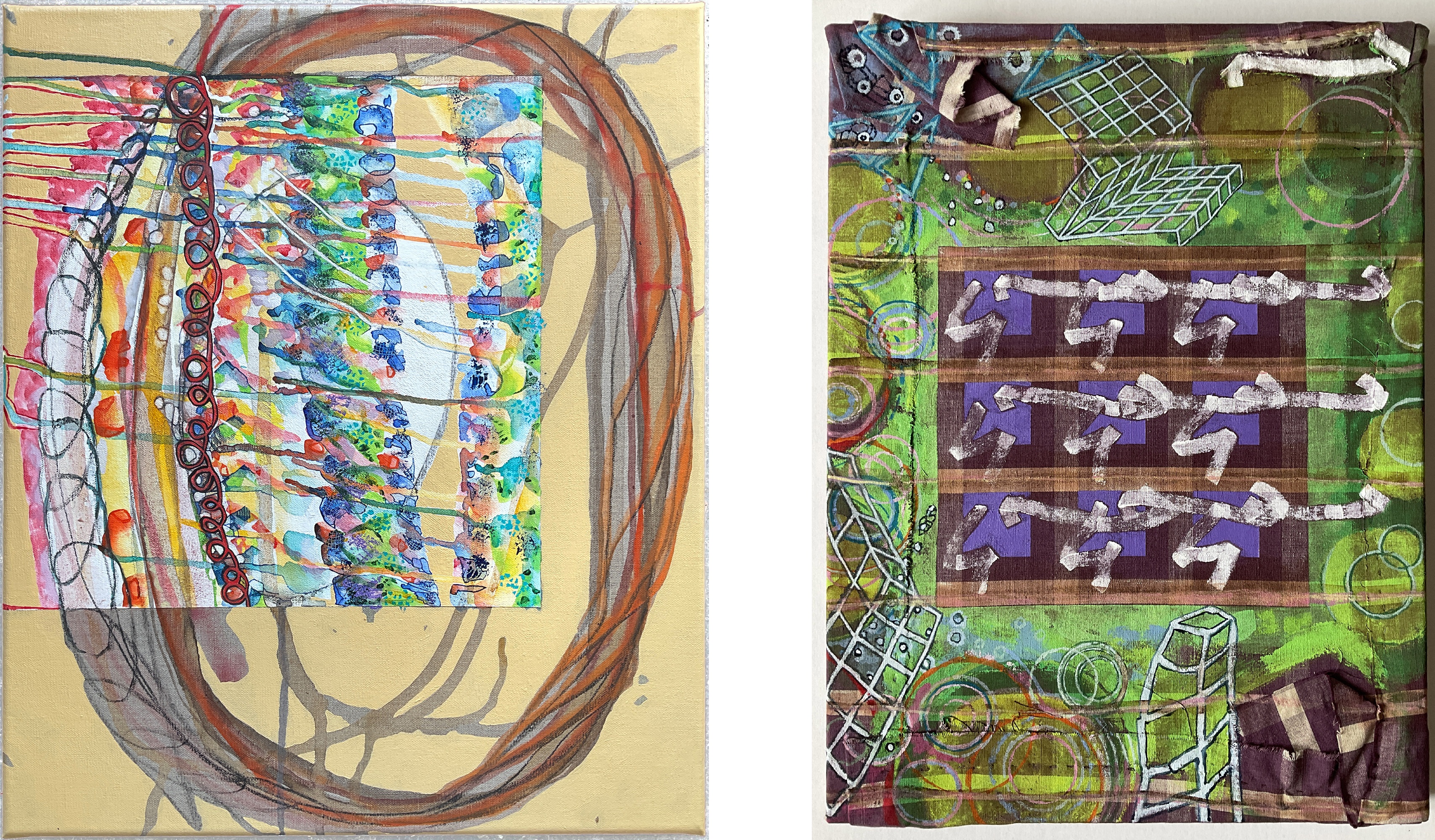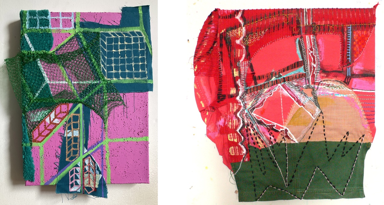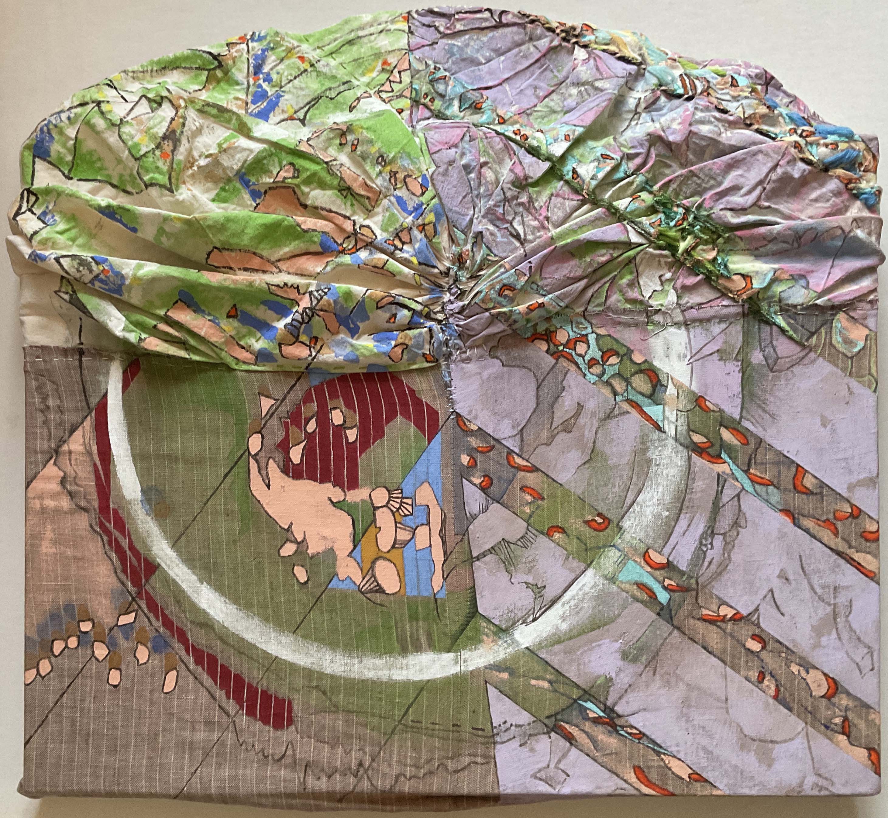 gouache, acrylic, cotton fabric, thread, canvas; 41 x 31 x 4 cm