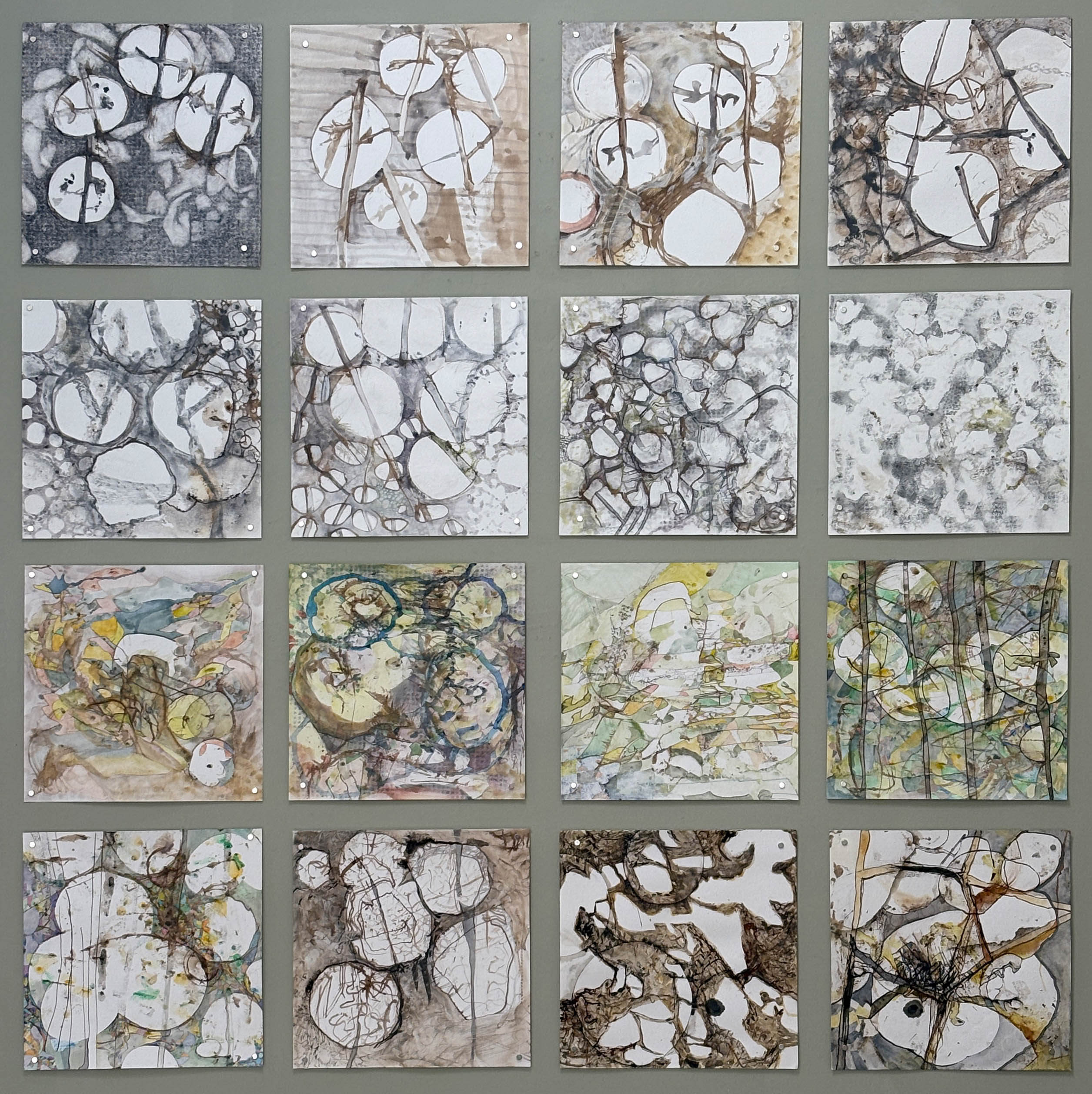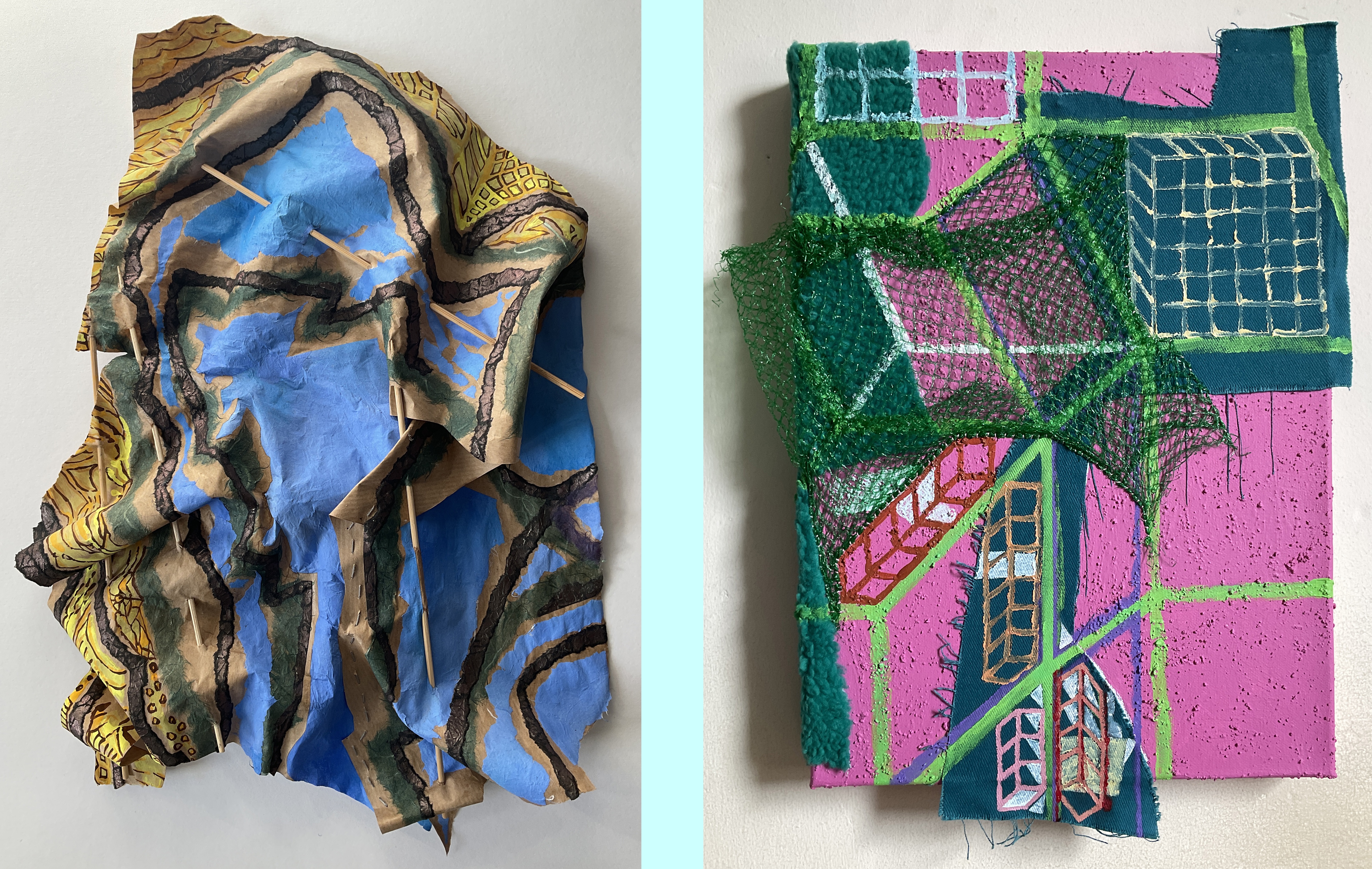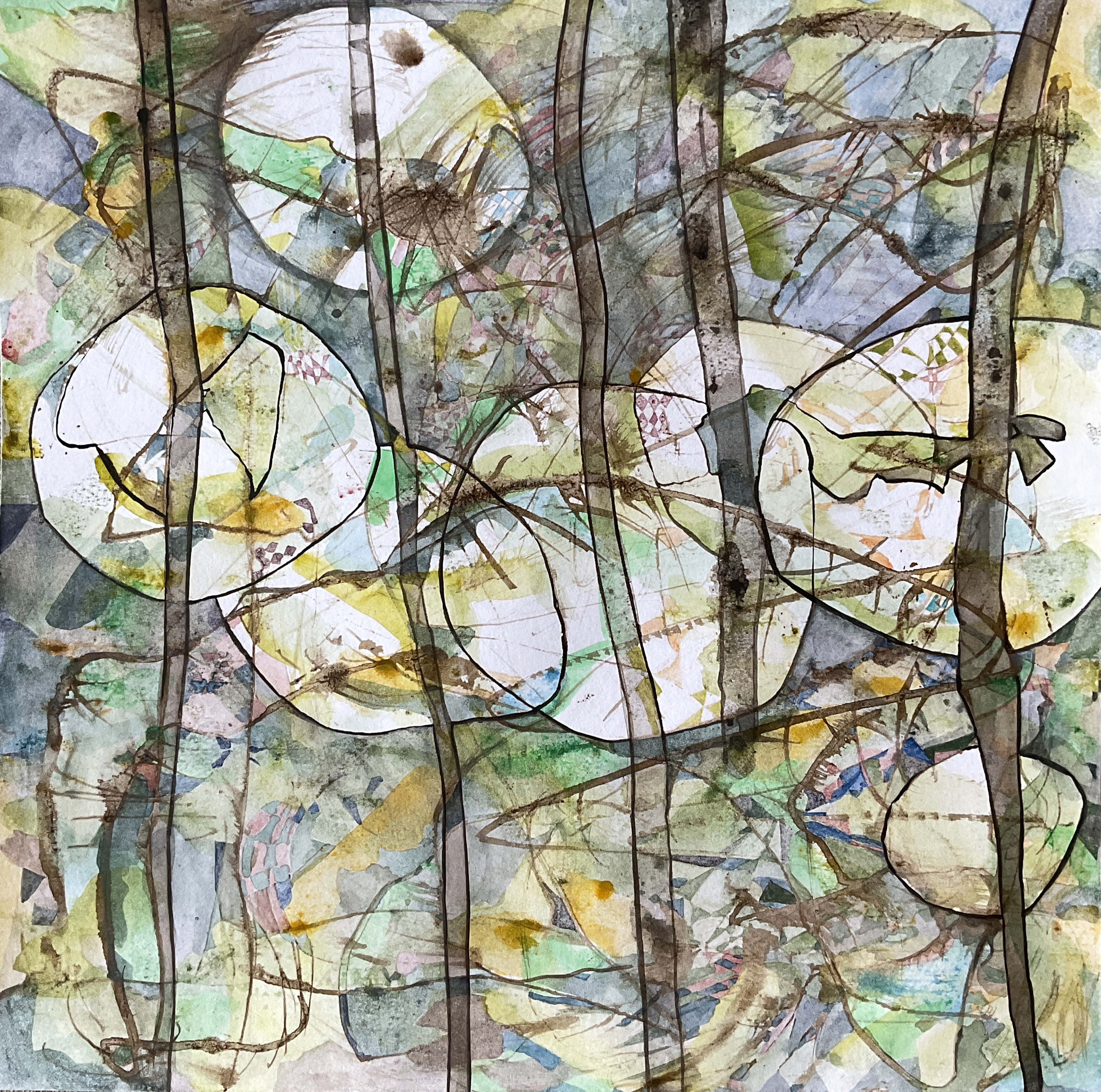 watercolour, gouache, acrylic, bamboo skewer, cotton thread, paper; 44 x 30 cm