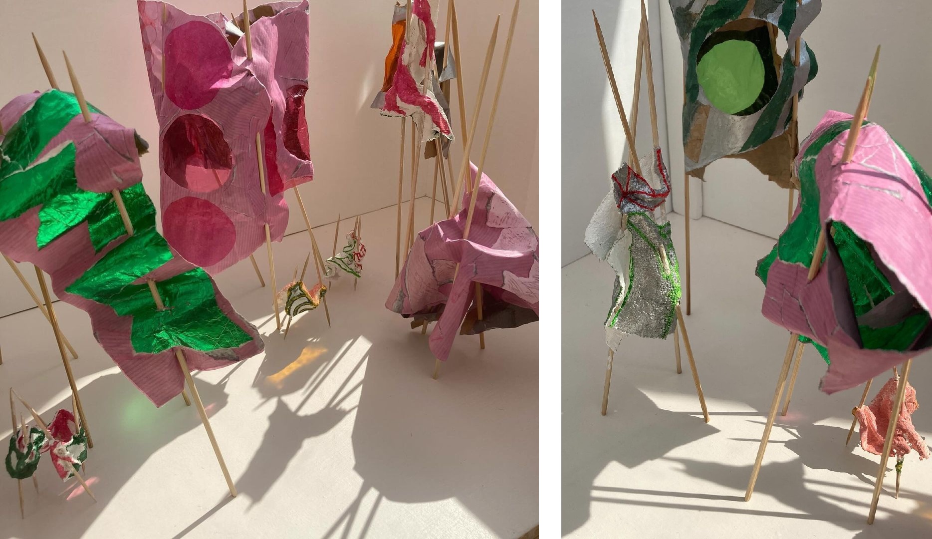 paint, paper, sweet wrappers, bamboo skewers, plaster bandage