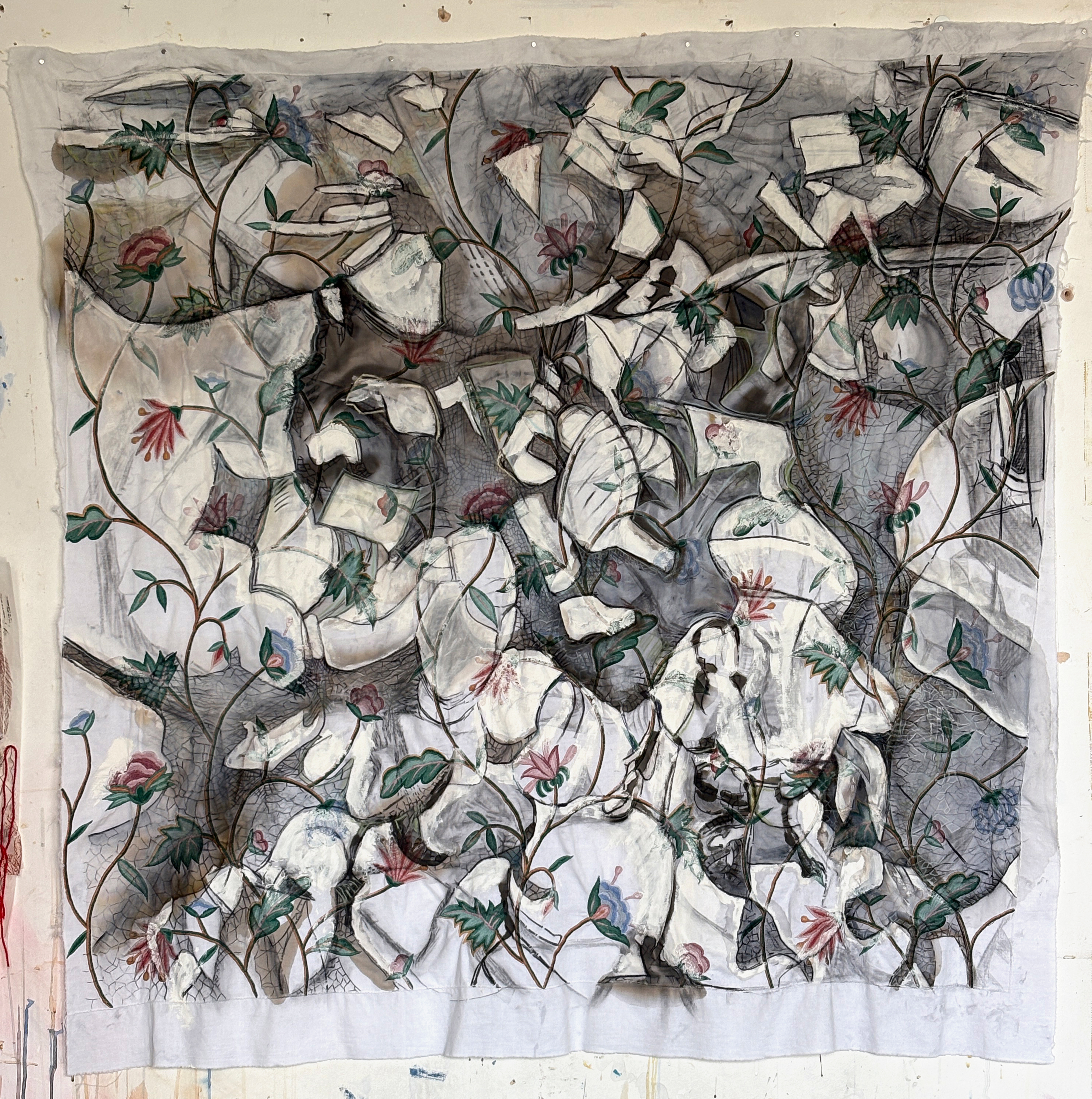 charcoal, watercolour, ink, gouache, conté crayon and embroidered cotton